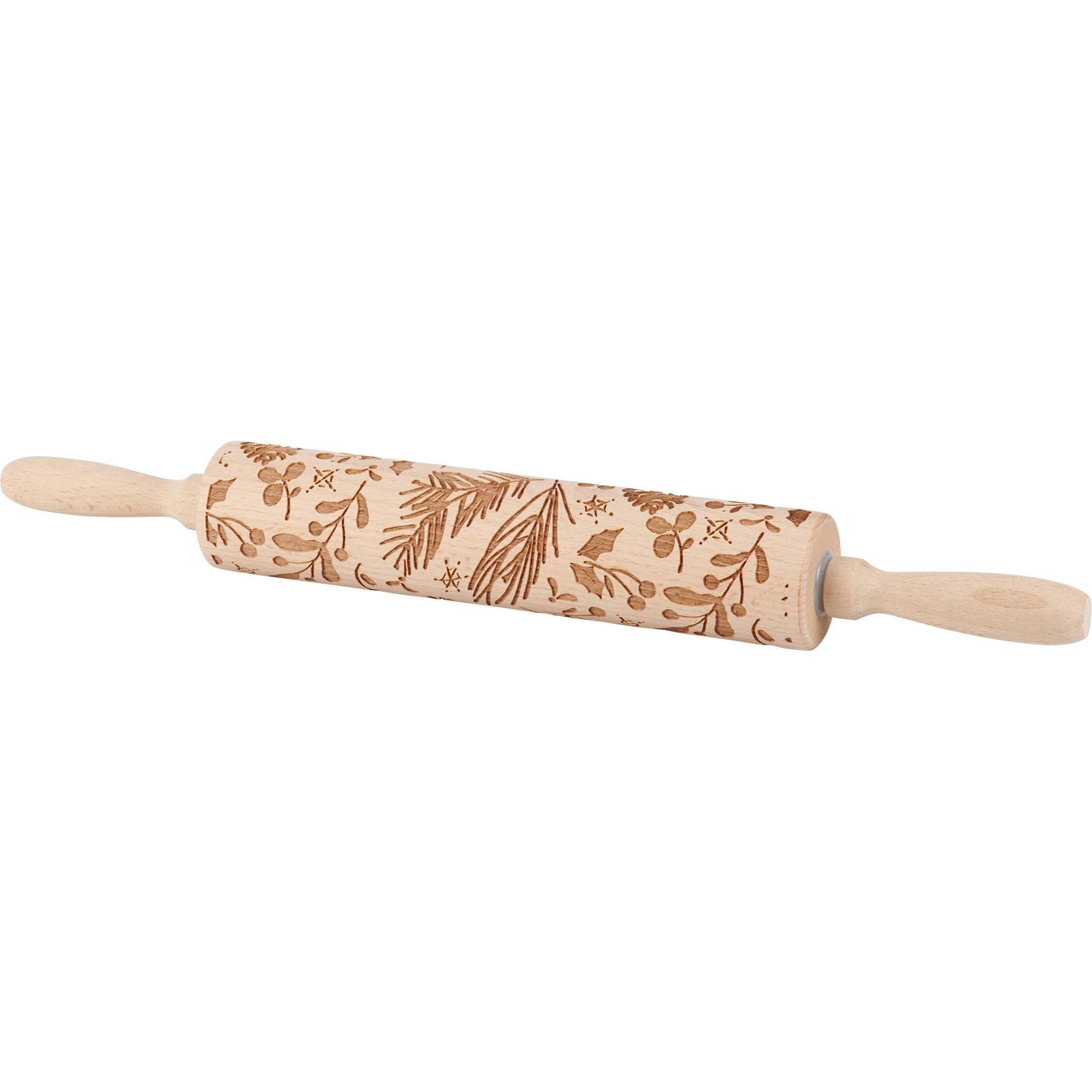 A large wooden rolling pin from our Christmas Collection featuring debossed Christmas greenery designs along the roller that create fun embossed patterns in pre-rolled dough. Our Christmas Greens rolling pin features natural beech wood and is hand-wash recommended. Hangtag is tied to pin with jute. A fun seasonal kitchen accessory that is also great for gifting.