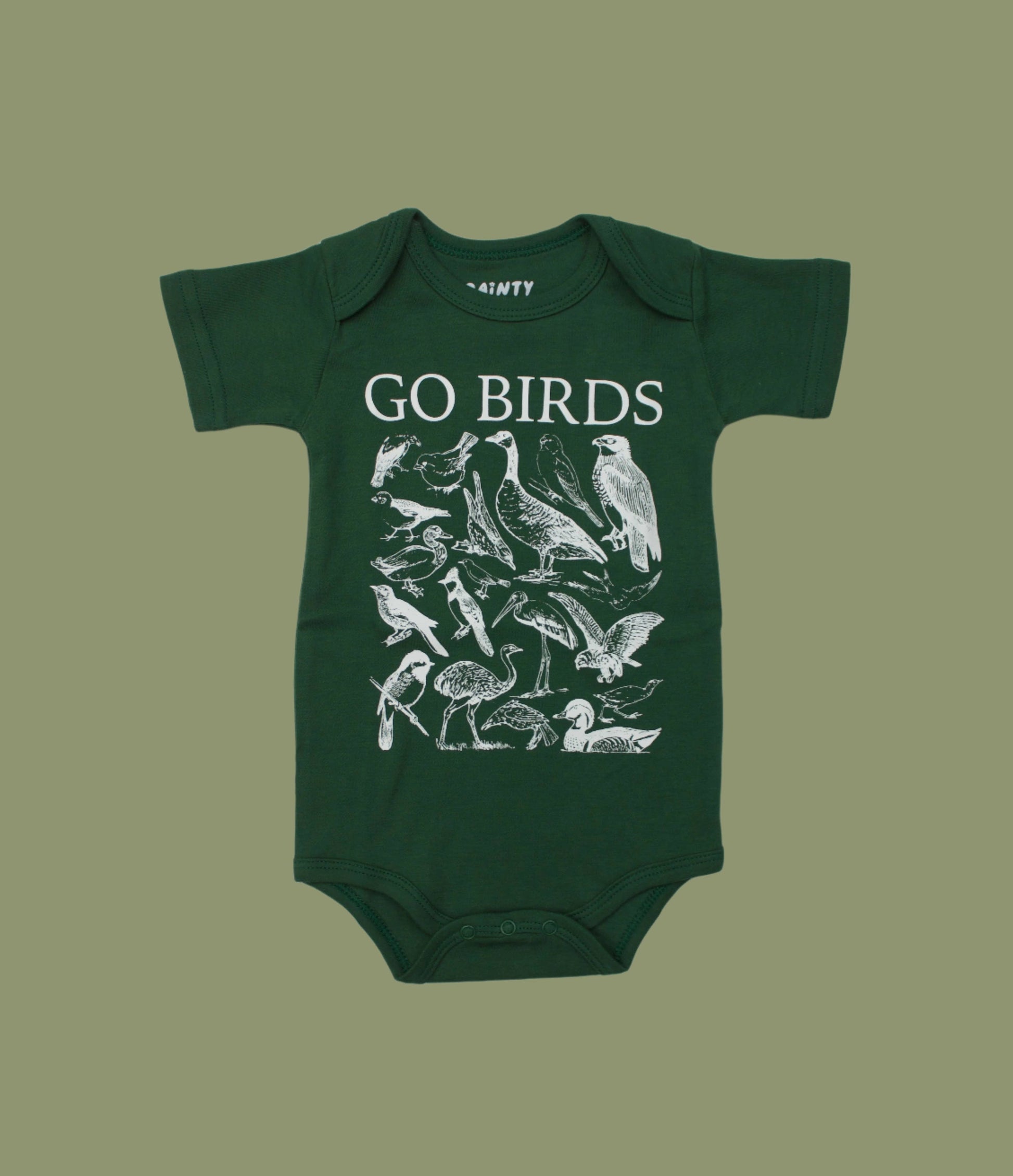 A forest green onesie with bird illustrations that reads "go birds." Printed on 100% cotton onesies.