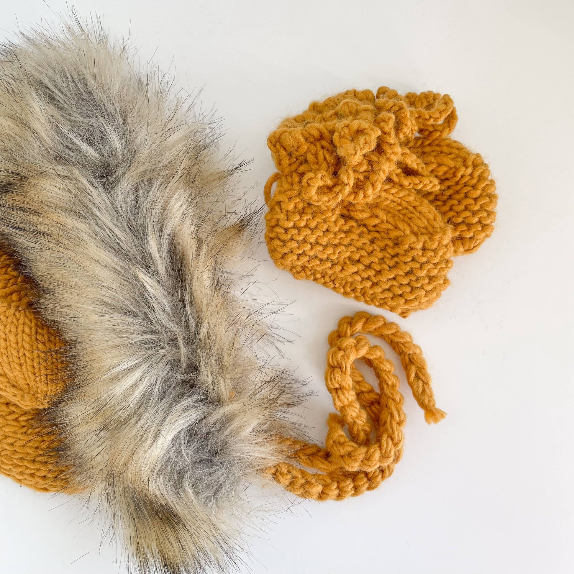 Fall baby necessity for Halloween costume or just because. Includes a hand-knit Lion bonnet with faux fur trim in our Mustard and a pair of matching Mustard hand-knit booties.