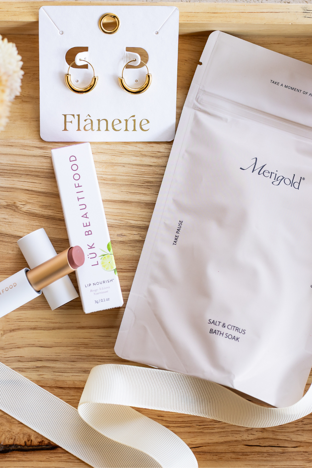 A curated bundle of items including organic bath salts from clean beauty brand, Merigold, a pair of 18K gold plated earrings from Flanerie and a lipstick from cult clean beauty favorite, Luk Beautifood.