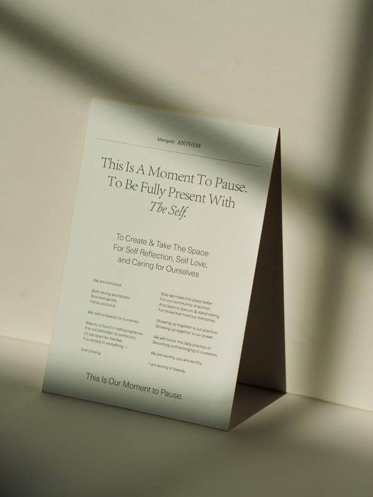 It is the heart behind Merigold. Intended to be read at the beginning of your facial mask ritual. Helping you set your intention for your moment of pause.