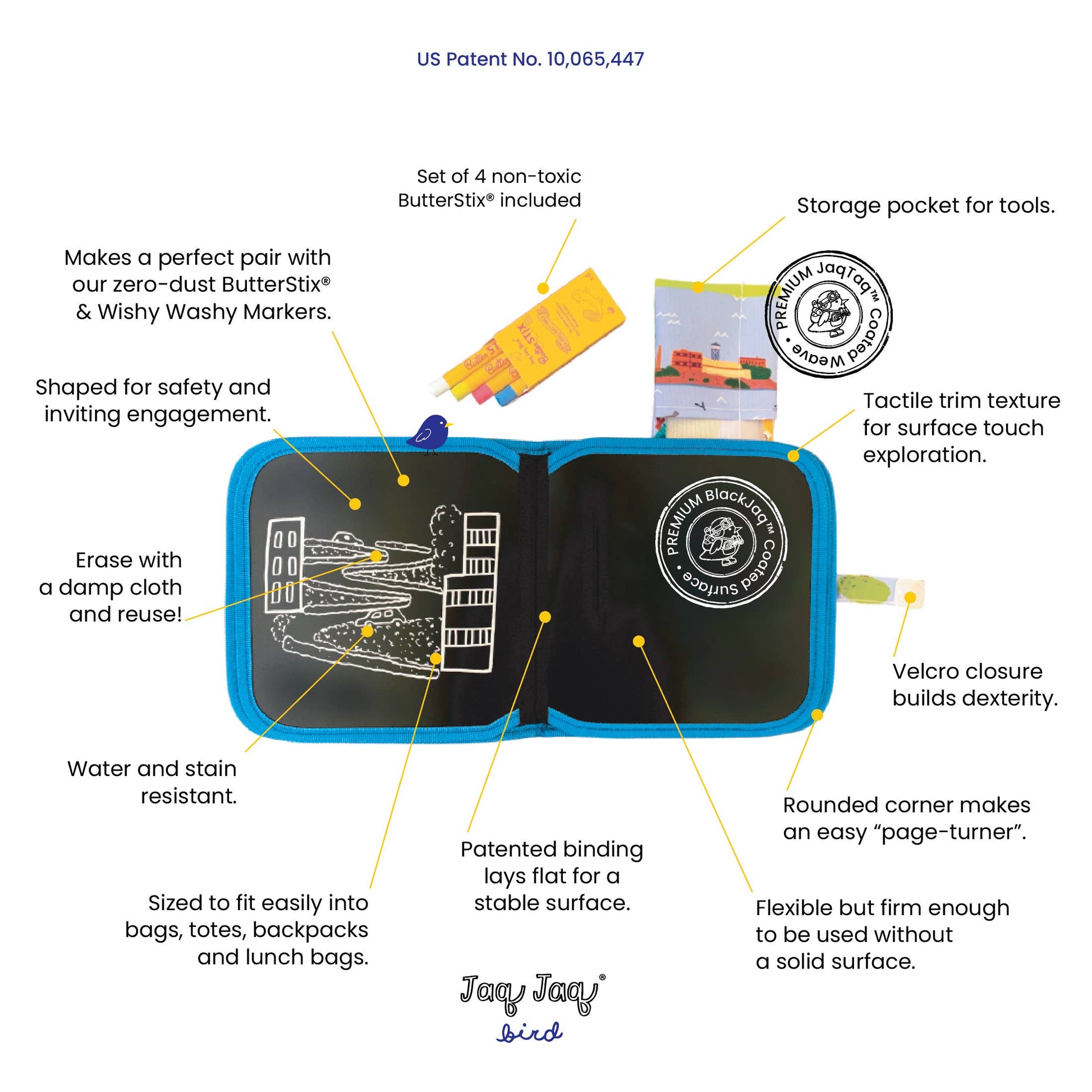 Please always test the erasability of ButterStix® when applying to any non-Jaq Jaq Bird® surface. Do not leave it on surfaces for an extended period of time.