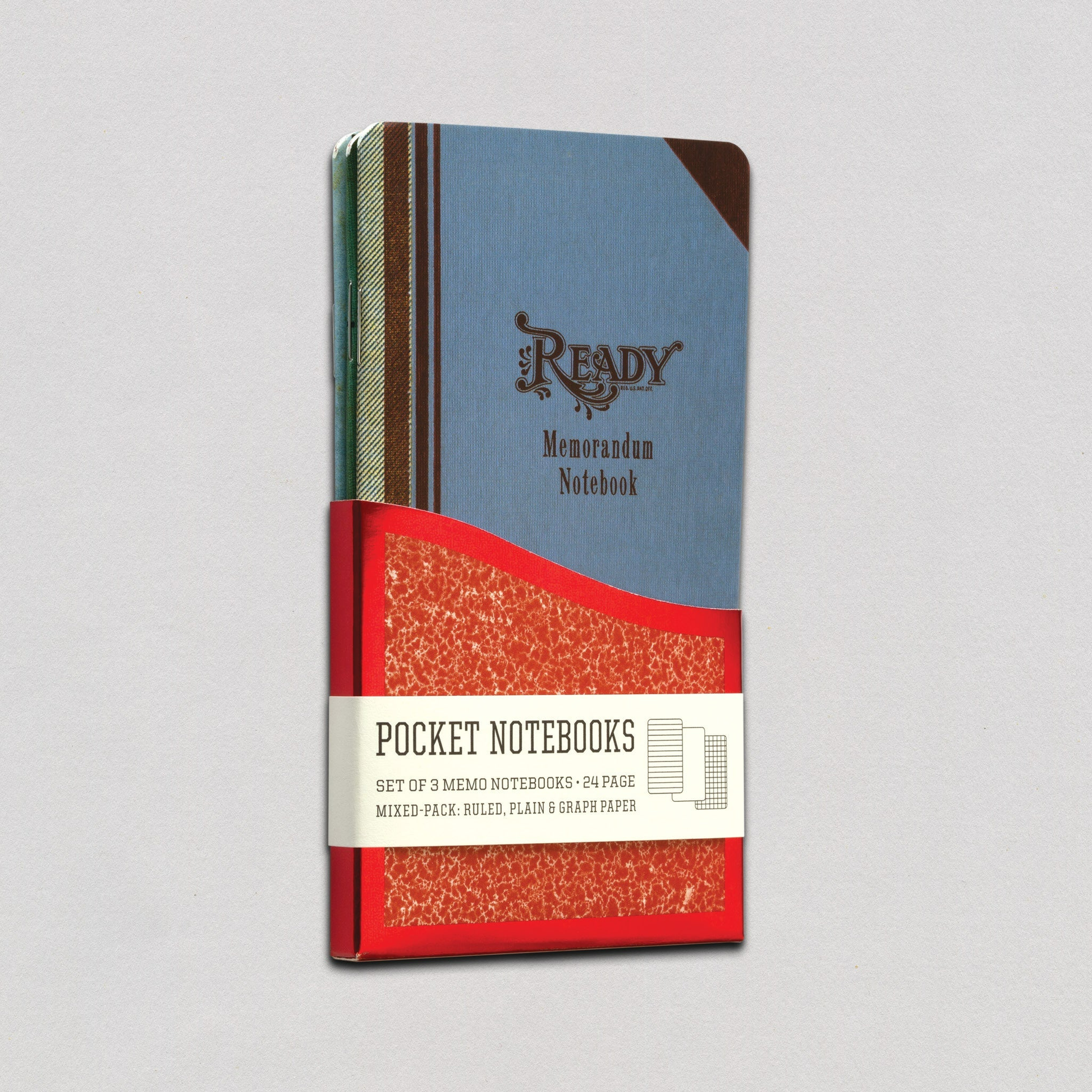 3 pack of 24 -page memo books, in three styles, Graph, Ruled, and Plain, sleeved in Wallet Case.We’ve always found the Receipt, Ledger, Cash and Memorandum notebooks of the past charming, with their decorated covers and leather or imitation leather corners, and so have designed these little notebooks to look like miniature Memorandum books of the past. They will inspire you to carry your to do list or your brilliant thoughts in any pocket.