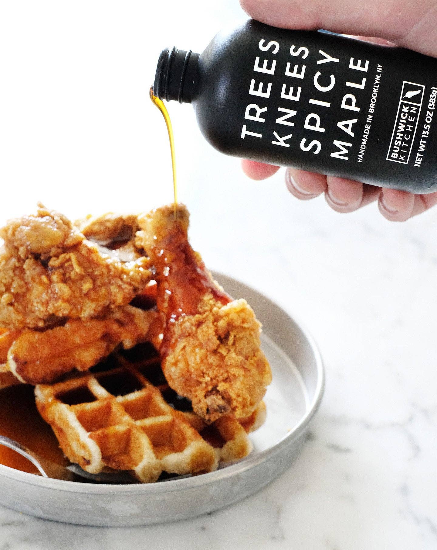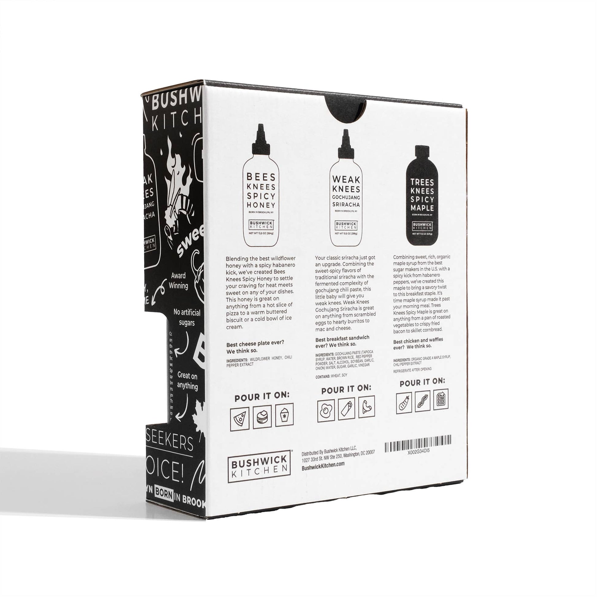 The Threes Knees Spicy Gift Set combines our original Spicy Honey, Gochujang Sriracha, and Spicy Maple Syrup with branded kitchen towel and a QR code linking to unique recipes. A substantial, gift-ready box looks great on store shelves, creating its own eye-catching display. Bees Knees Spicy Honey is gluten-free and paleo-friendly. Trees Knees Spicy Maple is gluten-free, paleo-friendly, and vegan. Weak Knees Gochujang Sriracha contains soy and wheat.