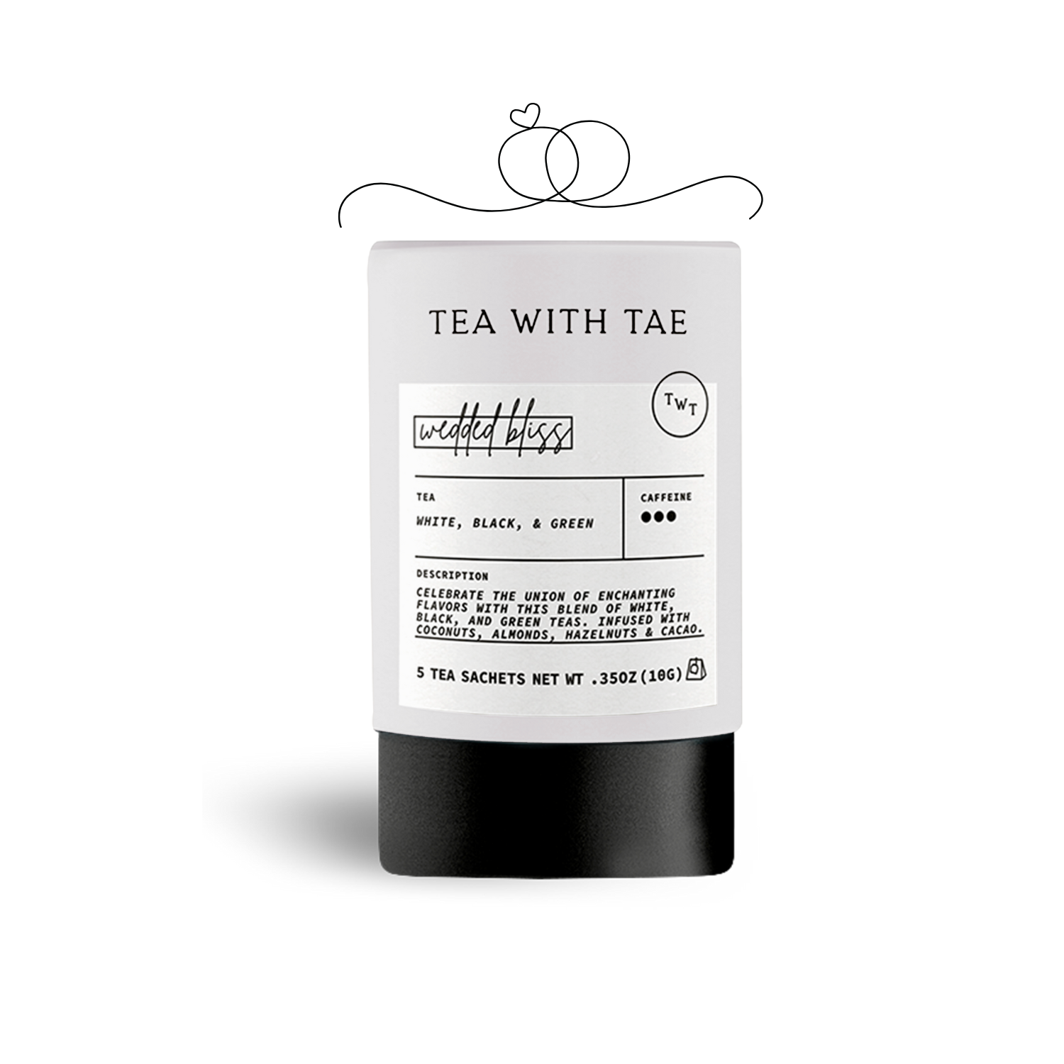 WEDDED BLISS: A truly exceptional and romantic blend, Wedded Bliss is a celebration of love and harmony, combining three premium whole-leaf teas: Pai Mu Tan white tea, Ceylon black tea, and Chinese green tea. This elegant fusion is enhanced with toasty almonds, coconut flakes, cinnamon chips, chocolate, and hazelnuts, creating a rich and indulgent flavor profile.