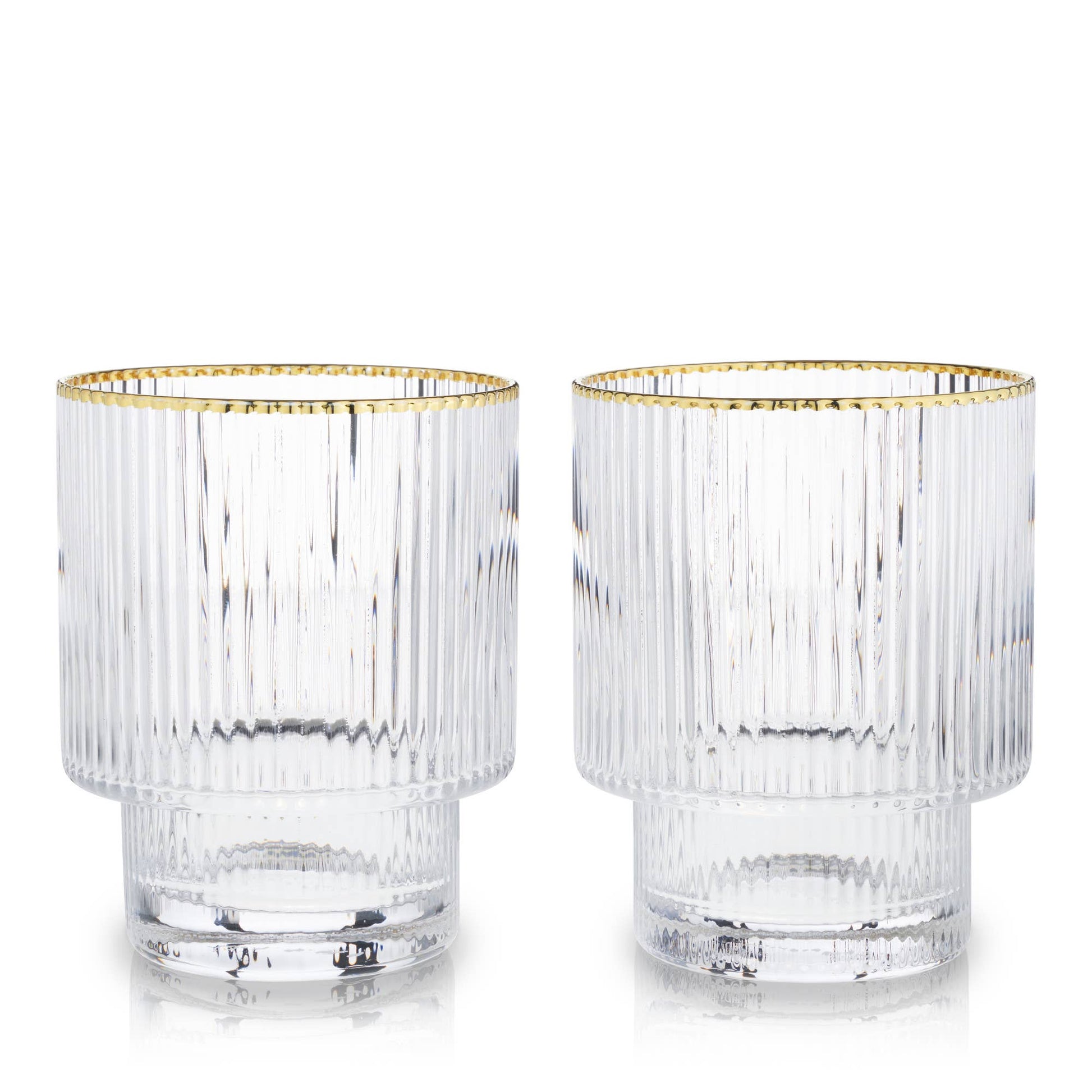 Elevate your home bar with this set of two stackable gold-rimmed crystal cocktail glasses. Made from lead-free crystal with a modern rippled texture and luxe gold-dipped rims, these 12 oz tumblers combine elegant design with everyday functionality—perfect for any cocktail, whiskey, bourbon, or mixed drink.